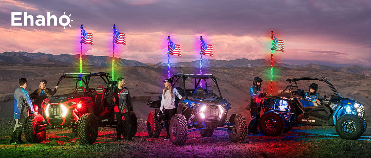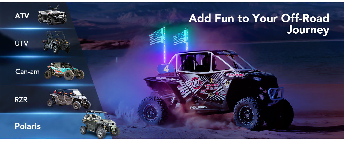 | A: There are reasons for getting RGB light whips besides the fact that they're insanely cool. They help you visually broadcast your location to other UTV drivers from dusk to dawn and align your side-by-side with various off-road safety rules and regulations. |