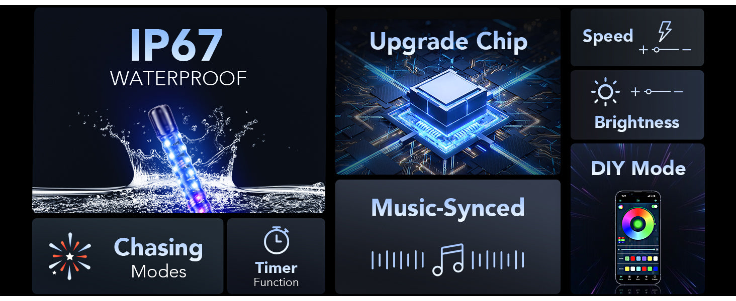 | Special Feature: | Customizable Flash Patterns, APP Control, 24Keys IF Remote, LED Dense Design, Customizable Music Modes |